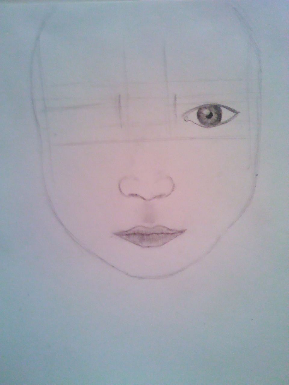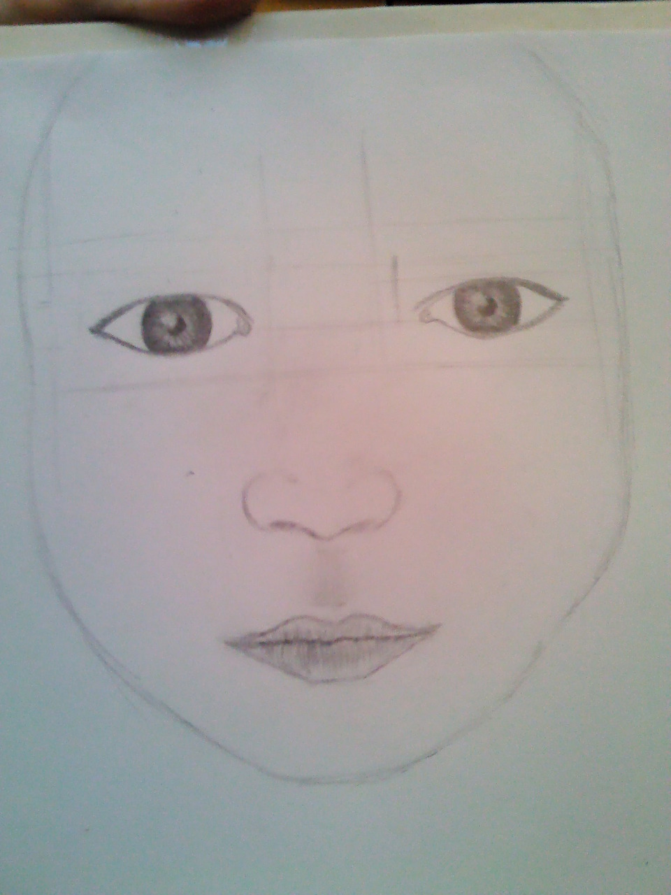 4. A obočie. To som nakreslila podľa pomocnej čiary, ktorá určuje, kde sa má obočie začínať. Takúto čiaru si vytvorím podľa toho, kde končia nozdry nosa.